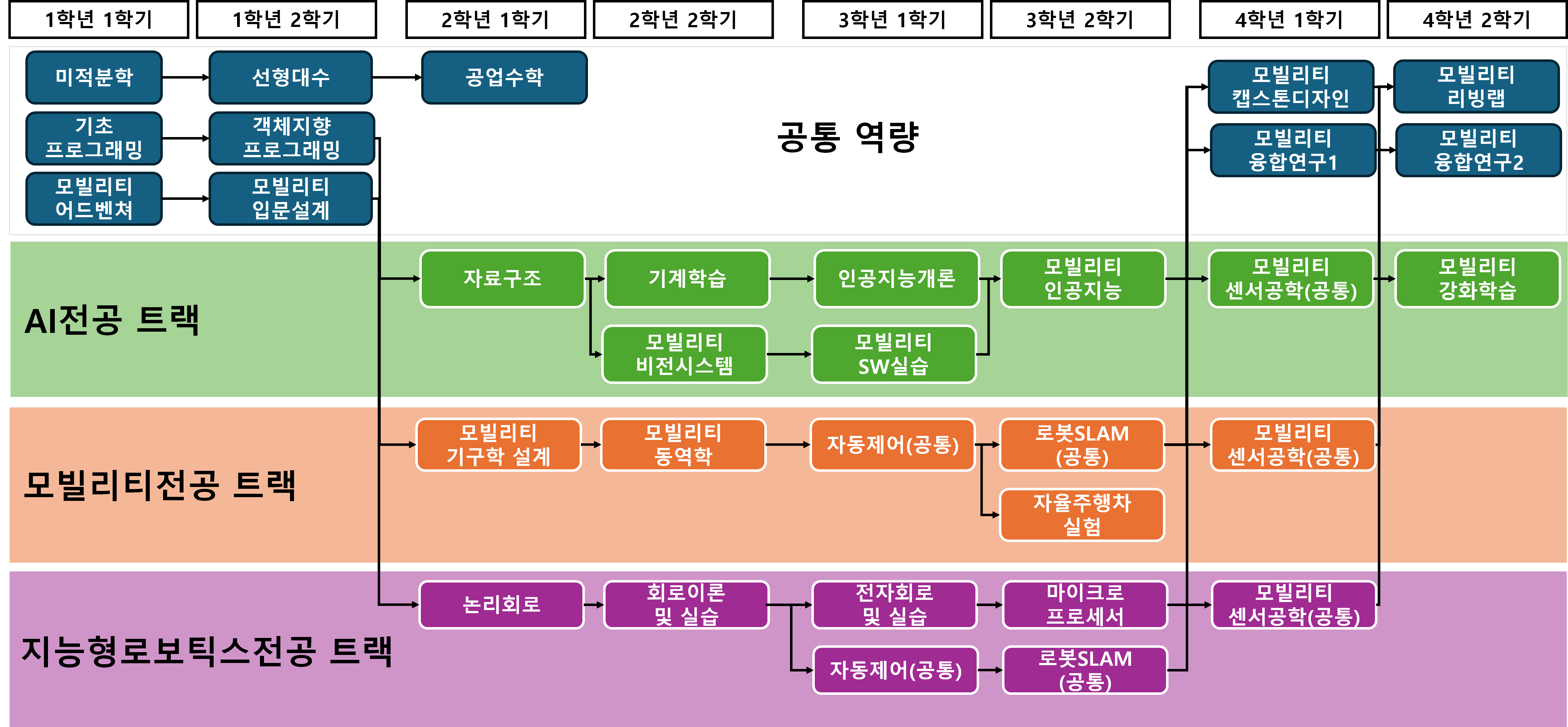 • 각 교육과정 트랙은 기초-심화-융합의 3단계로 교육과정이 구성되었으며 매학기 1개 이상의 실습과목을 배치하여 실습 위주의 교육과정을 구성